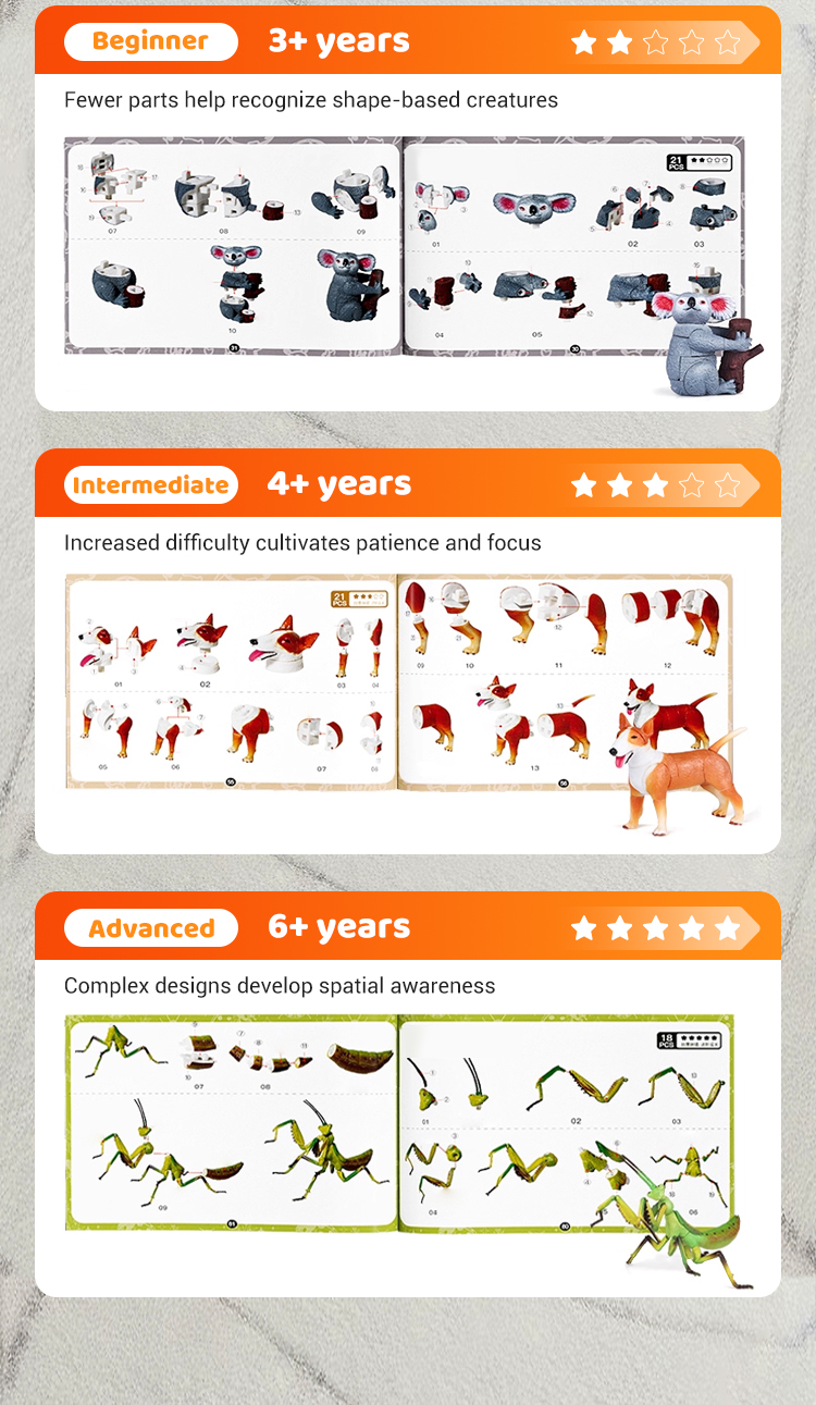 TÖBBFUNKCIÓS TANESZKÖZ – Ösztönzi mind a technikai szerelési készségeket, mind a kreatív történetmesélést. A gyermekek pontos replikákat építhetnek vagy kitalált lénykombinációkat alkothatnak, fejlesztve logikai gondolkodásukat és művészi kifejezőképességüket.